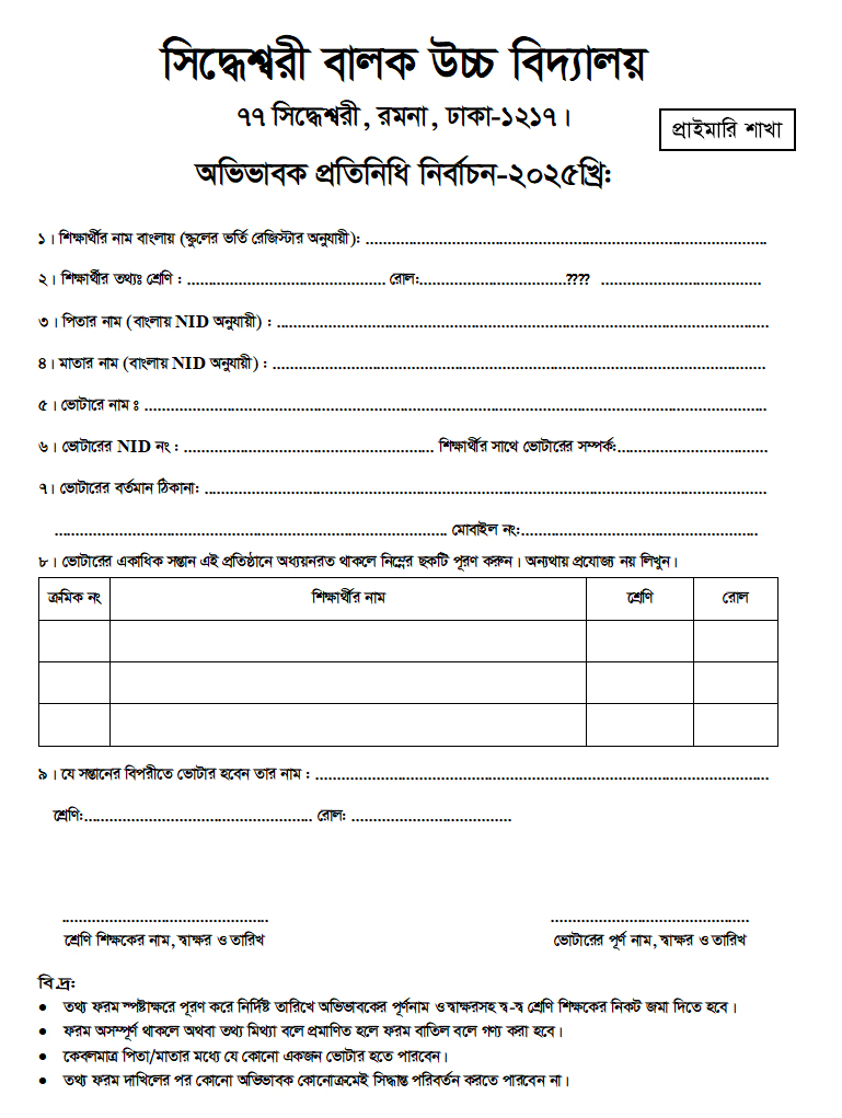 নিয়মিত ম্যানেজিং কমিটি গঠনের জন্য অভিভাবক প্রতিনিধি ফরম-২০২৫খ্রি: (প্রাথমিক শাখা)